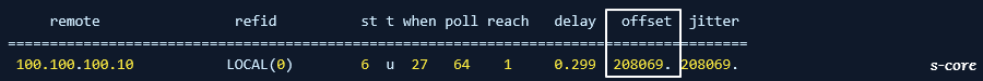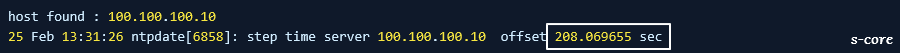 - 아래 명령 실행 시 현재 서버가 NTP 서버와의 시간이 208초 차이 난다는 것을 알 수 있습니다.