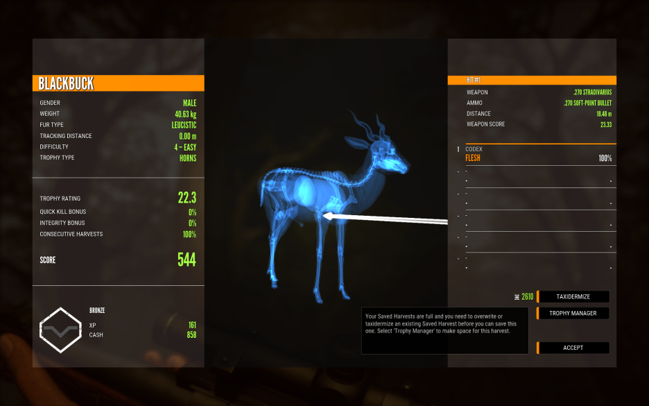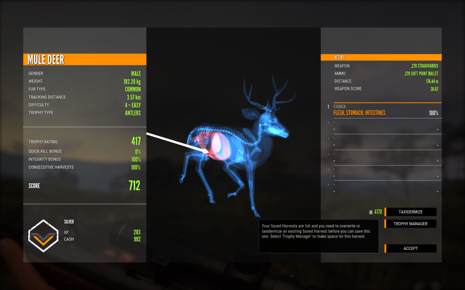 9-Legendary 등급의 야생 물소를 35m 거리에서 정확히 허파와 간을 맞추어서 다이아몬드 스코어 달성.