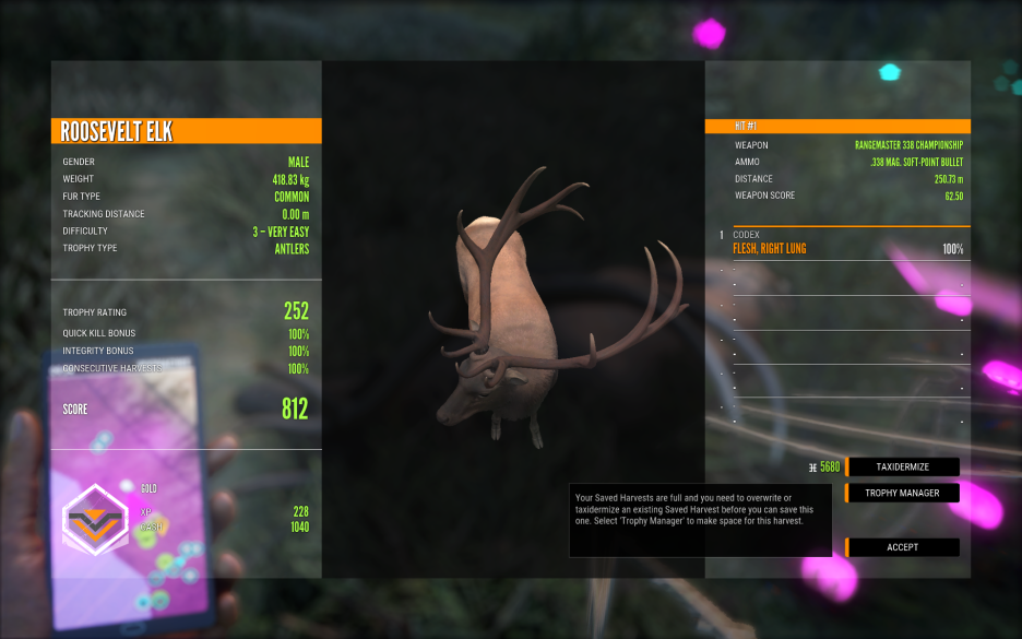 Rangemaster 338 Championship 소총과 총알은 .338 Mag, Soft-point Bullet 확장탄을 장착하고 282미터가 넘는 장거리에서 양쪽 폐 (double lung)를 정확히 맞추었으나 무기선택이 잘못되어 Silver 스코어 달성.