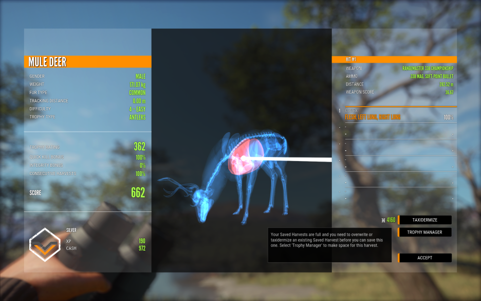 113미터 중거리에서 .270 Stradivarious 소총과 .270 Soft-Point Bullet 확장탄으로 장기를 맞추고 Silver 등급 획득
