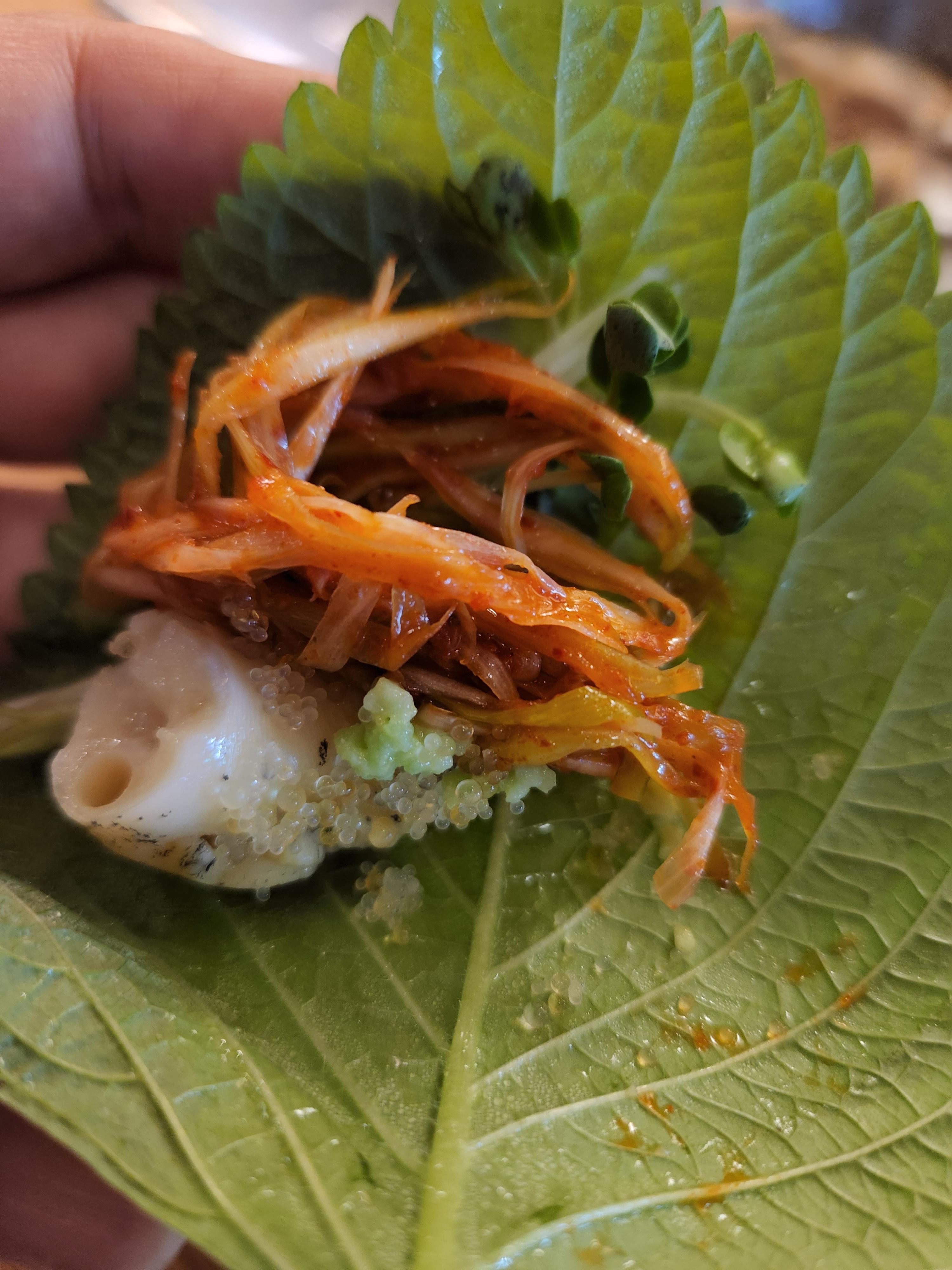 배부른데고 이거 깻잎하고, 날치알, 야채와 같이 쌈싸먹으니 맛이 장난이 아니네.