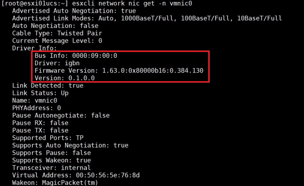 # esxcli network nic get -n vmnicX // 해당 드라이버 버전 및 펌웨어 버전 확인
