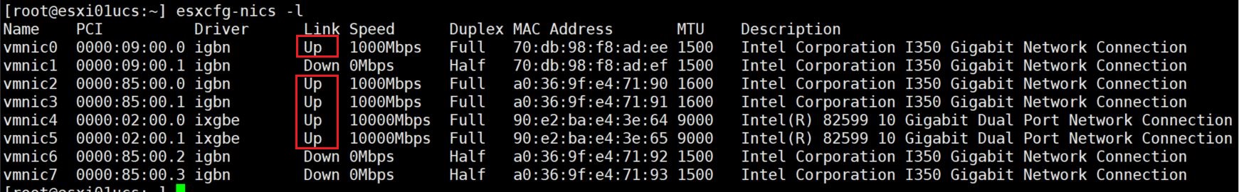 # esxcfg-nics -l //NIC 업다운 유무 확인