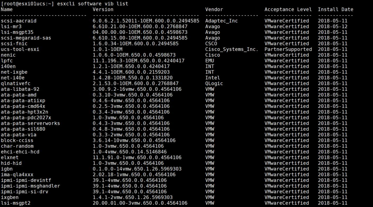 # esxcli software vib list