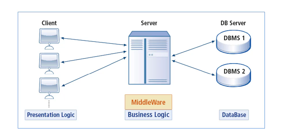 - DBMS를 직접 클라이언트가 연결되어 동작하는 방식이 여러 가지 단점이 있었음을 알게 된 후 이러한 문제점을 해결하기 위해 등장한것이 미들웨어라는 개념이다. 클라이언트와 DBMS사이에 위의 그림과 같이 또 다른 서버를 두는 방식이다. 클라이언트는 단순히 요청만 중앙에 있는 서버에게 보내고, 중앙에 있는 서버(미들웨어)는 대부분의 로직을 수행한다. 이때, 데이터를 조작할 일이 있으면 DBMS에게 부탁한다. 그리고 그 결과를 클라이언트에게 전송하면 클라이언트는 그 결과를 화면에 보여주게 된다. 클라이언트가 해야했던 복잡한로직은 사라지고, 단순히 화면에 그 결과만 보여주고 사용자로부터 값을 입력 받아서 미들웨어에게만 보내는 역할만 수행하면 되기 때문에 크기가 매우 작아지게 됐다.