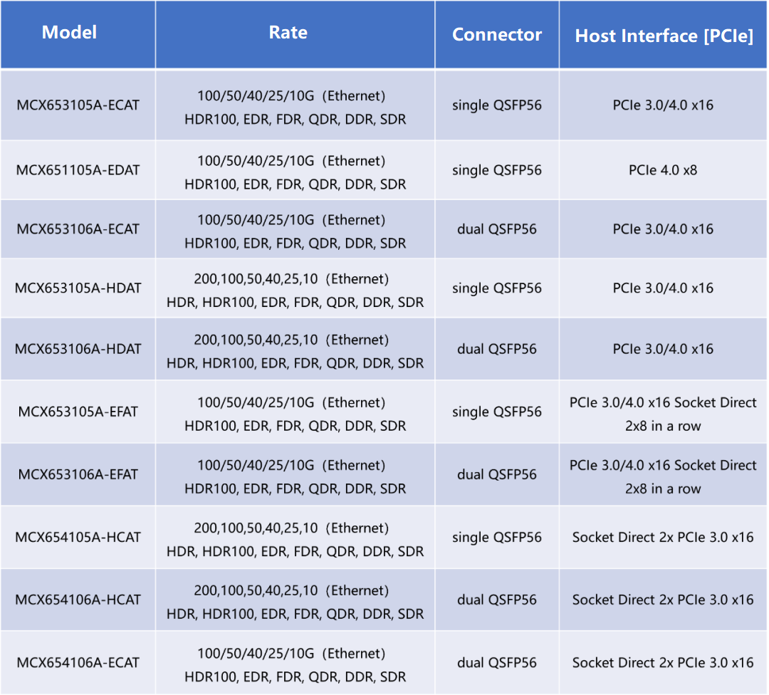 HDR 네트워크 어댑터는 스위치보다 훨씬 다양합니다. HDR100 네트워크 어댑터는 100G의 전송 속도를 지원합니다. 100개의 HDR200 포트는 2G ~ 100x100G 케이블을 통해 HDR 스위치에 연결할 수 있습니다. 100G EDR 네트워크 카드와 달리 HDR100 네트워크 카드의 4G 포트는 25X2G NRZ 및 50X4G PAM200 전송을 모두 지원합니다. HDR NIC는 200G 전송 속도를 지원하며 XNUMXG 다이렉트 케이블을 통해 스위치에 연결할 수 있습니다. 두 가지 인터페이스 속도 외에도 서비스 요구 사항에 따라 각 속도의 단일 포트, 이중 포트 및 PCIe 네트워크 어댑터를 선택할 수 있습니다. Fiber Mall에서 제공하는 일반적인 InfiniBand HDR 네트워크 어댑터 모델은 다음과 같습니다.