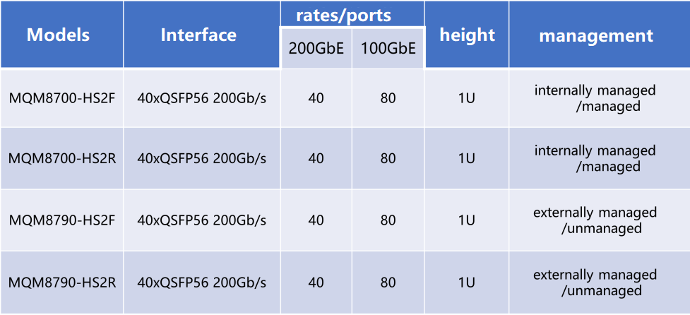 200G HDR 스위치에는 QM8700 및 QM8790의 두 가지 옵션이 있습니다. 두 모델의 유일한 차이점은 관리 모드입니다. QM8700은 대역 외 관리를 위한 제어 인터페이스를 제공하는 반면 QM8790은 관리를 위해 NVIDIA UFM®(Unified Fabric Manager) 플랫폼이 필요합니다.