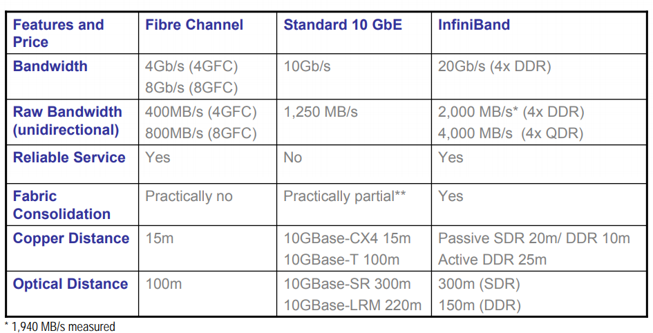 인피니밴드의 속도를 기존 방식과 비교하면 그 장점을 바로 알 수 있다. PCI 방식이 양방향 2.128Gbps 속도인 반면 인피니밴드는 가장 느린 형태로 구성해도 5Gbps의 대역폭을 제공한다.