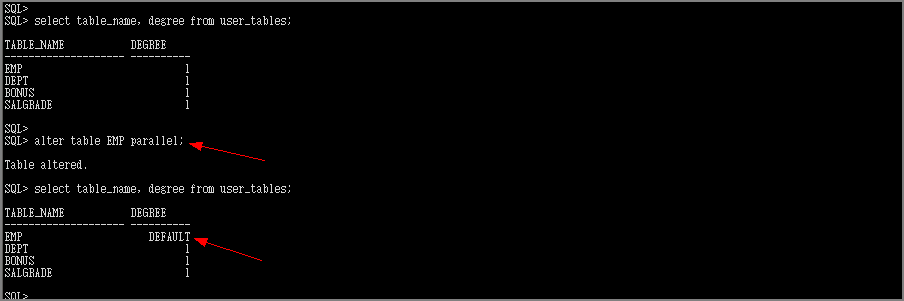 아래와 같이 alter table ~ parallel 커맨드로 테이블의 DOP를 변경할 수 있습니다.