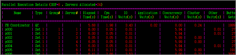 Realtime SQL Monitoring 에서 보면 아래와 같이 병렬처리 프로세스들이 어떻게 일했는지 정확히 확인할 수 있습니다.