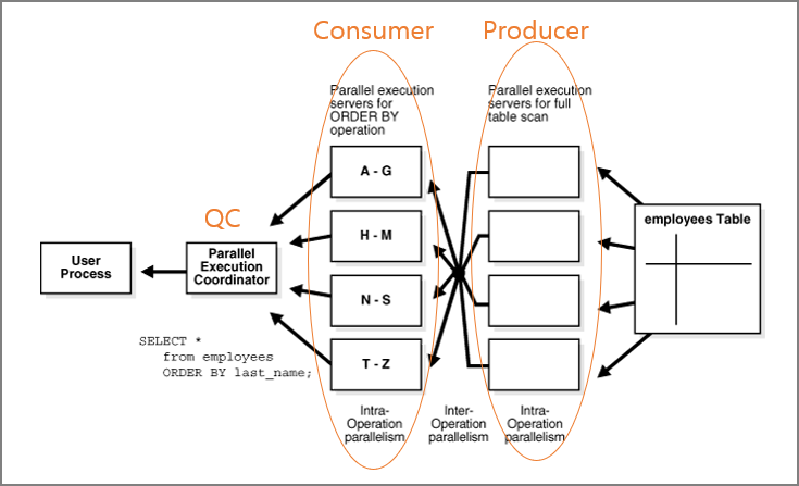 테이블에서 데이터를 읽는 작업을 하는 병렬프로세서들을 Producer 라고 하고, 이 읽은 데이터를 받아서 Sorting(정렬), DML, DDL, Join 등을 수행하는 작업을 하는 병렬프로세들을 Consumer 라고 합니다. 그리고, 작업된 결과들을 취합(통합)하는 작업을 하는 프로세서가 있는데 이를 QC(Query Coordinator) 라고 합니다.