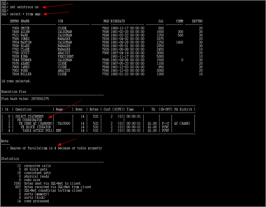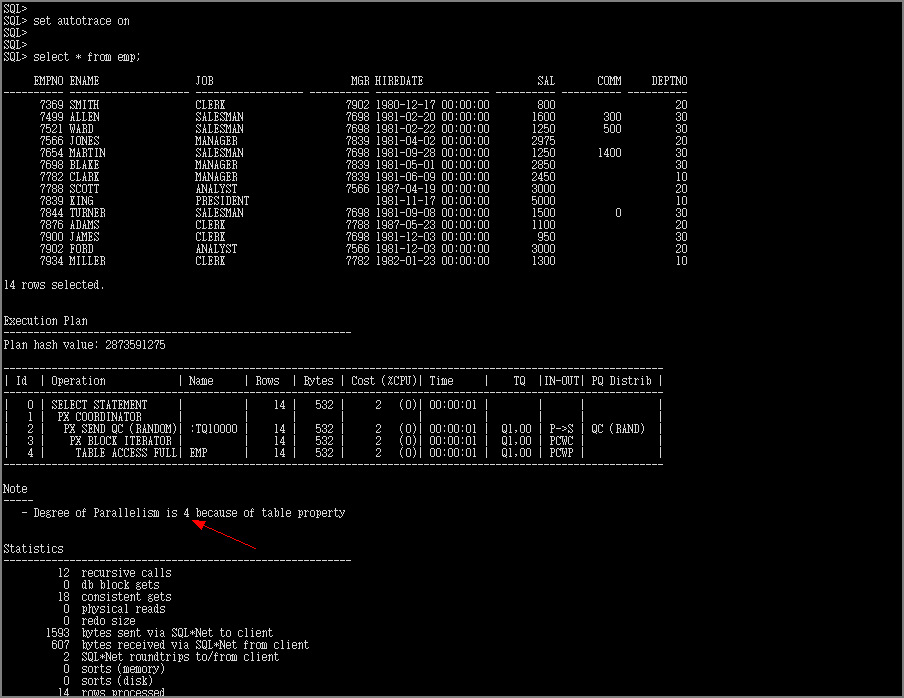 그럼, 위에서 변경한 EMP 테이블의 DOP 가 정말 4로 돌아가는지 확인해보겠습니다.