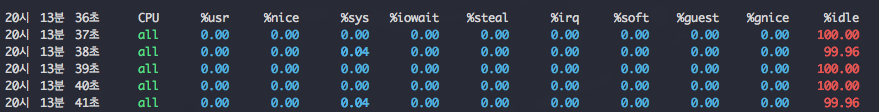- sy : system CPU. system call 에 의해 사용되는 CPU 비율