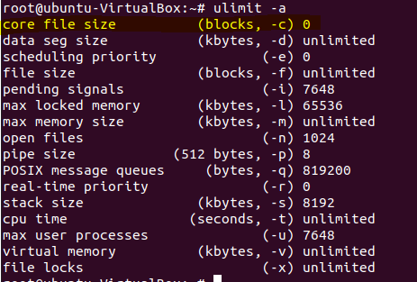 아래 출력물을 보시면 core file size가 0으로 셋팅이 되어있는것을 보실 수 있는데요.