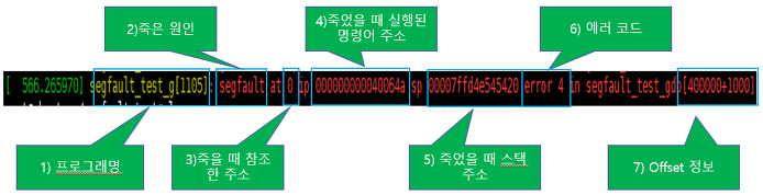 | 1 | 프로그램 명 | segfault_test 이고 pid 는 959 이다. |