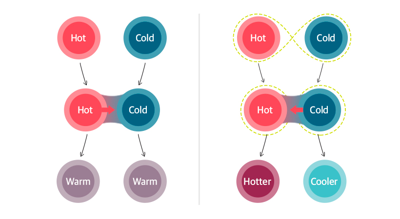 ▲ (왼쪽부터) 일상적인 열교환과 열역학 2법칙이 배제된 열교환. 두 상태 모두 1법칙은 만족한다