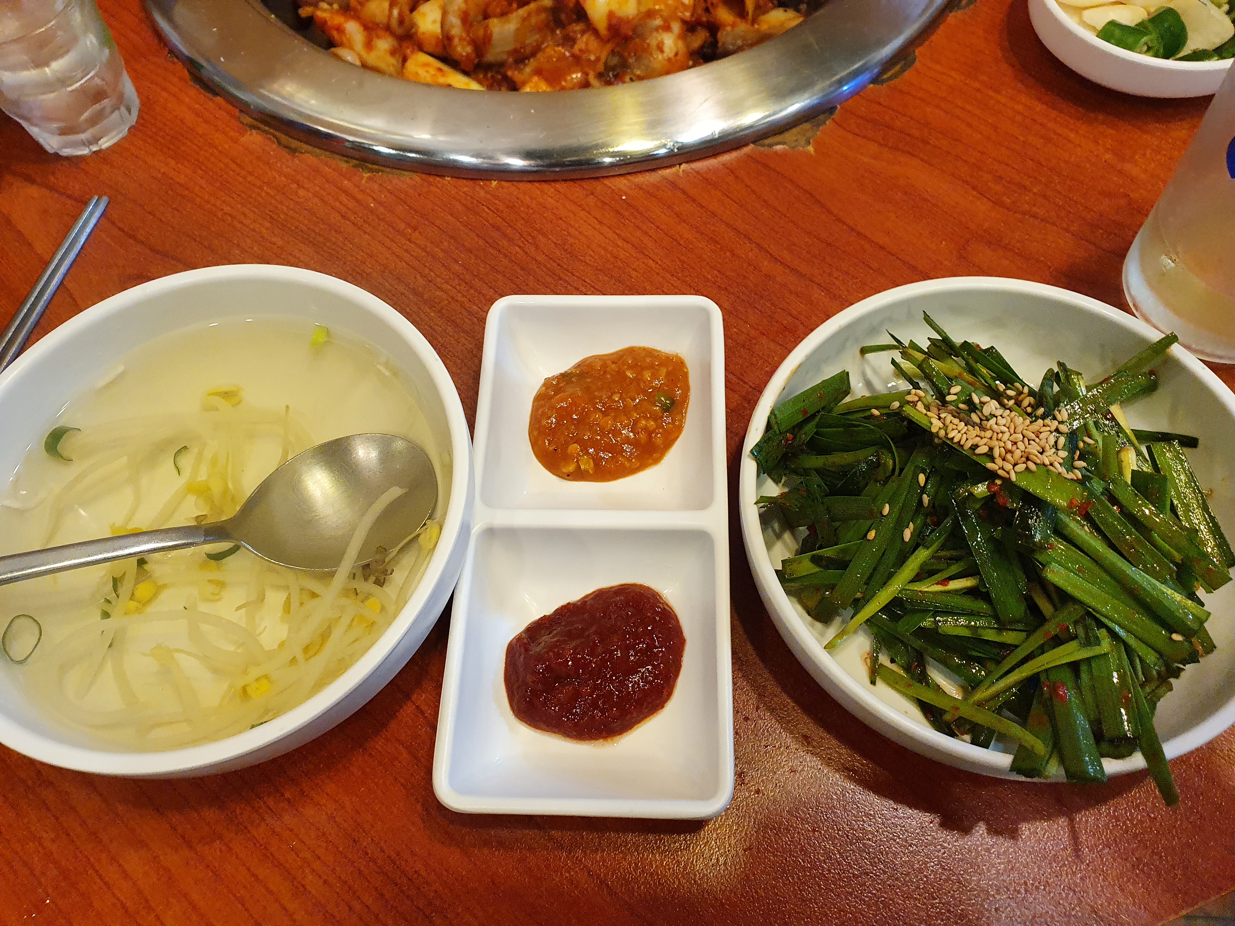 밑반찬은 별거 없다. 상추와 깻잎이 싱싱하다.